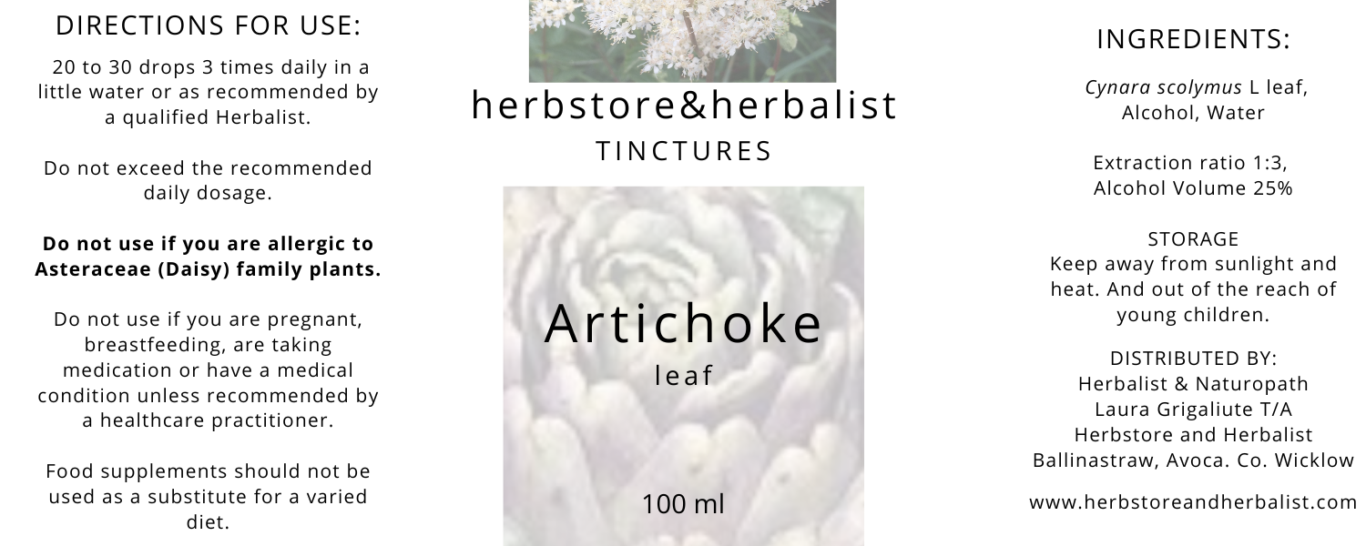 Artichoke leaf tincture 100ml is made by infusion from carefully harvested Cynara scolymus L leaves.